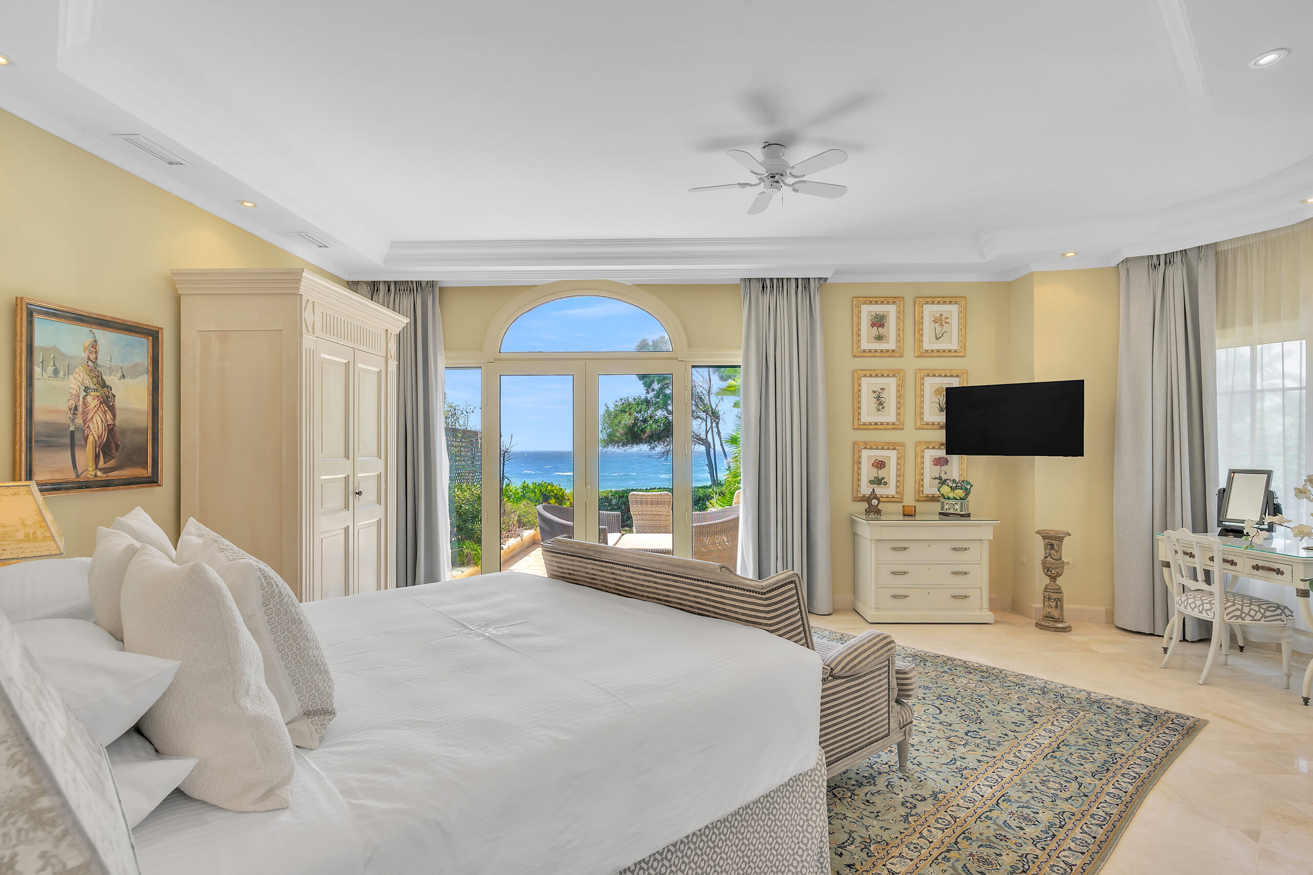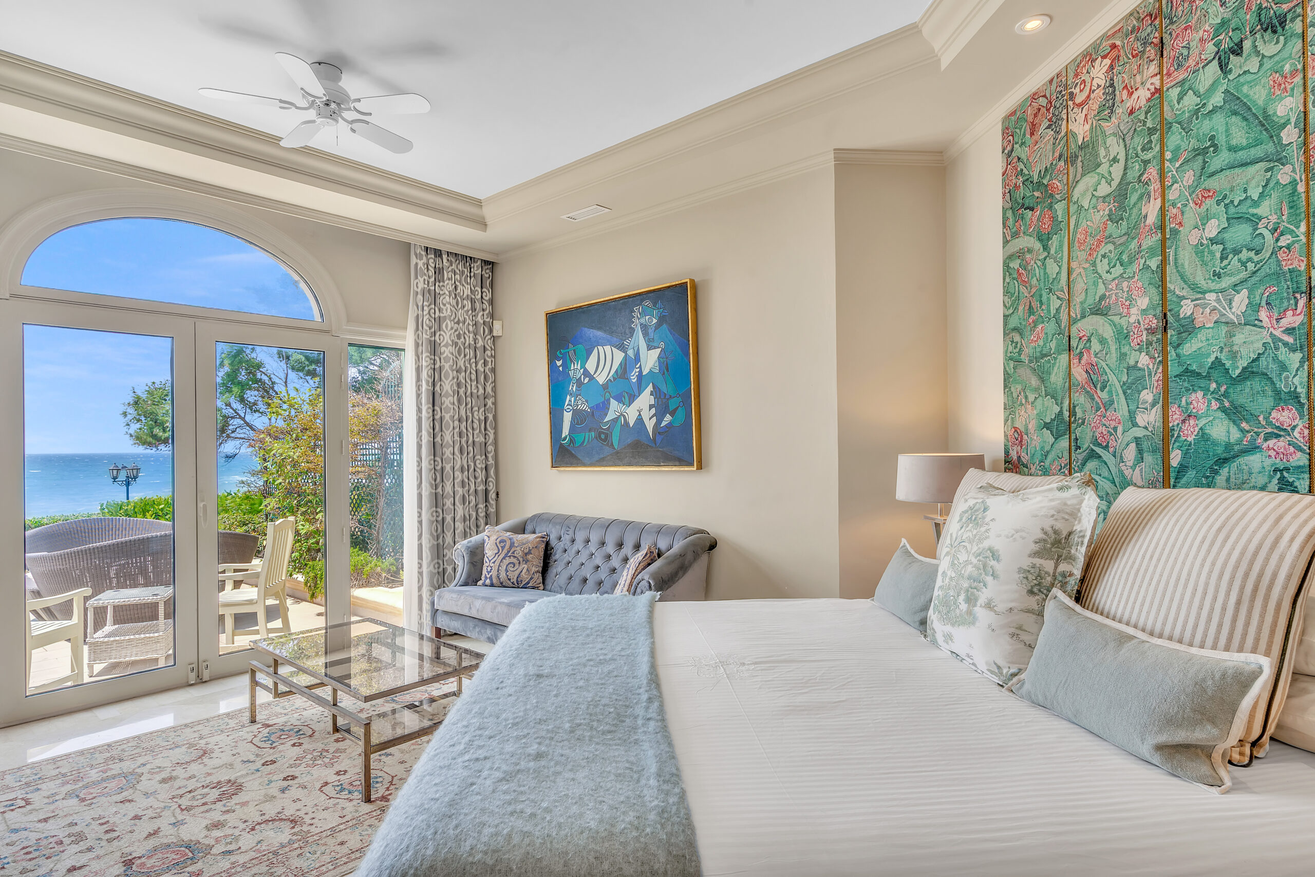 Situated at the top of the Villa, offering 39m2 of space, this suite has the most stunning views of the sea, garden and pool. The room has semi-circular windows to the front of the room with 180° views. There is a walk-in wardrobe that leads to a beautiful en suite, the floors and walls are