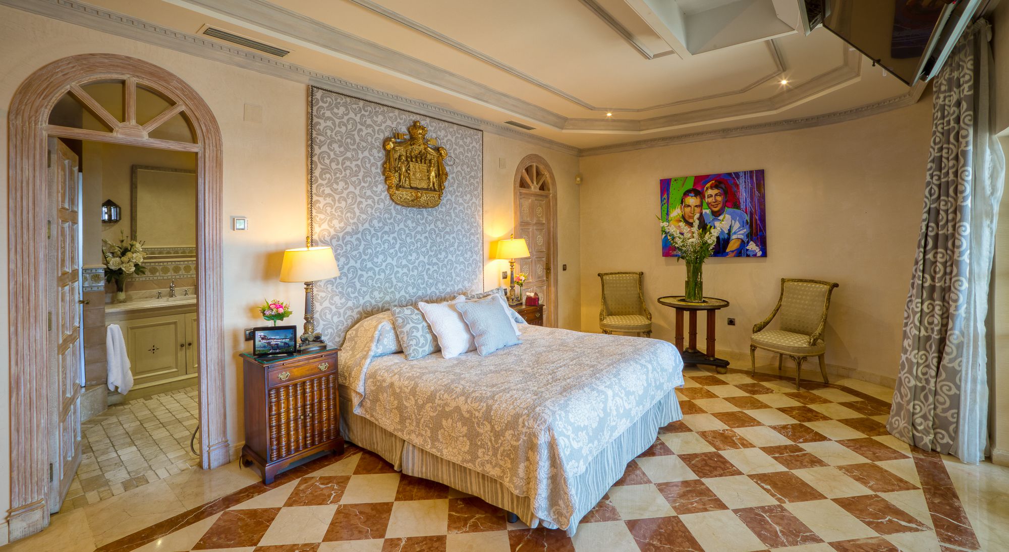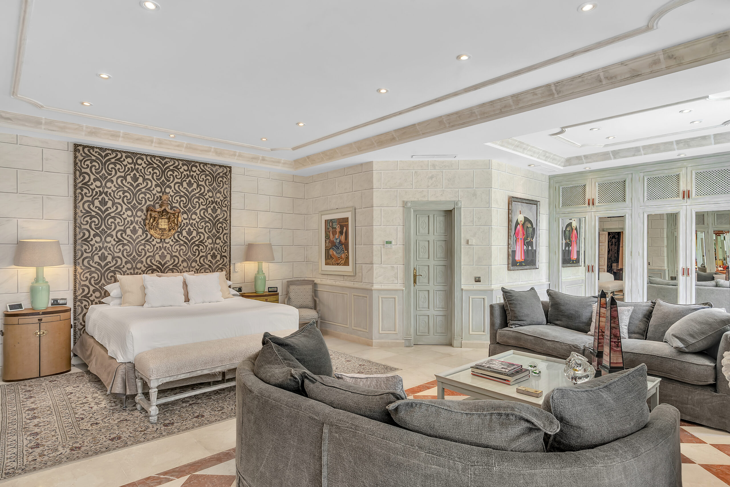 A suite with lovely views of the terrace, swimming pool, garden and sea. Located next to the main sitting room, offering 26m2 of space, it is opposite one of the two spas. It has a jacuzzi bath with a TV, in a very prettily decorated en suite.