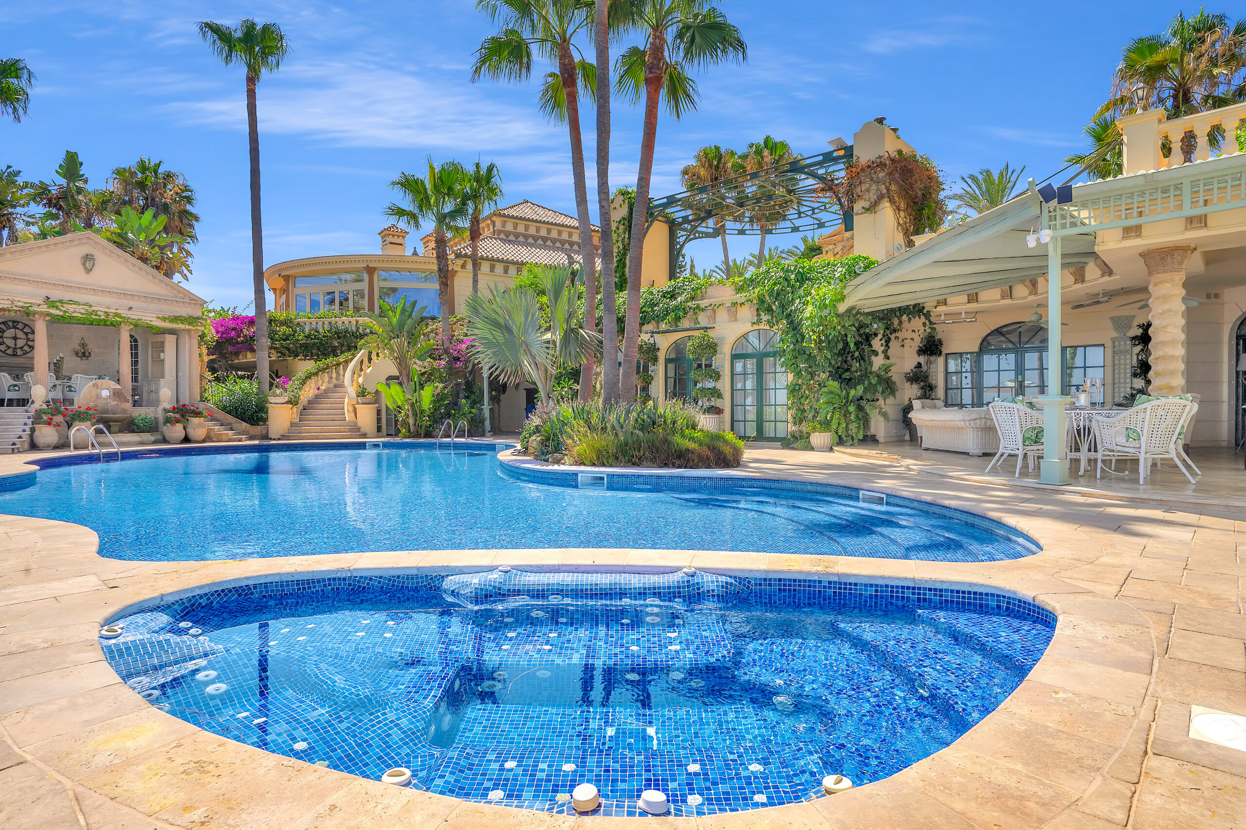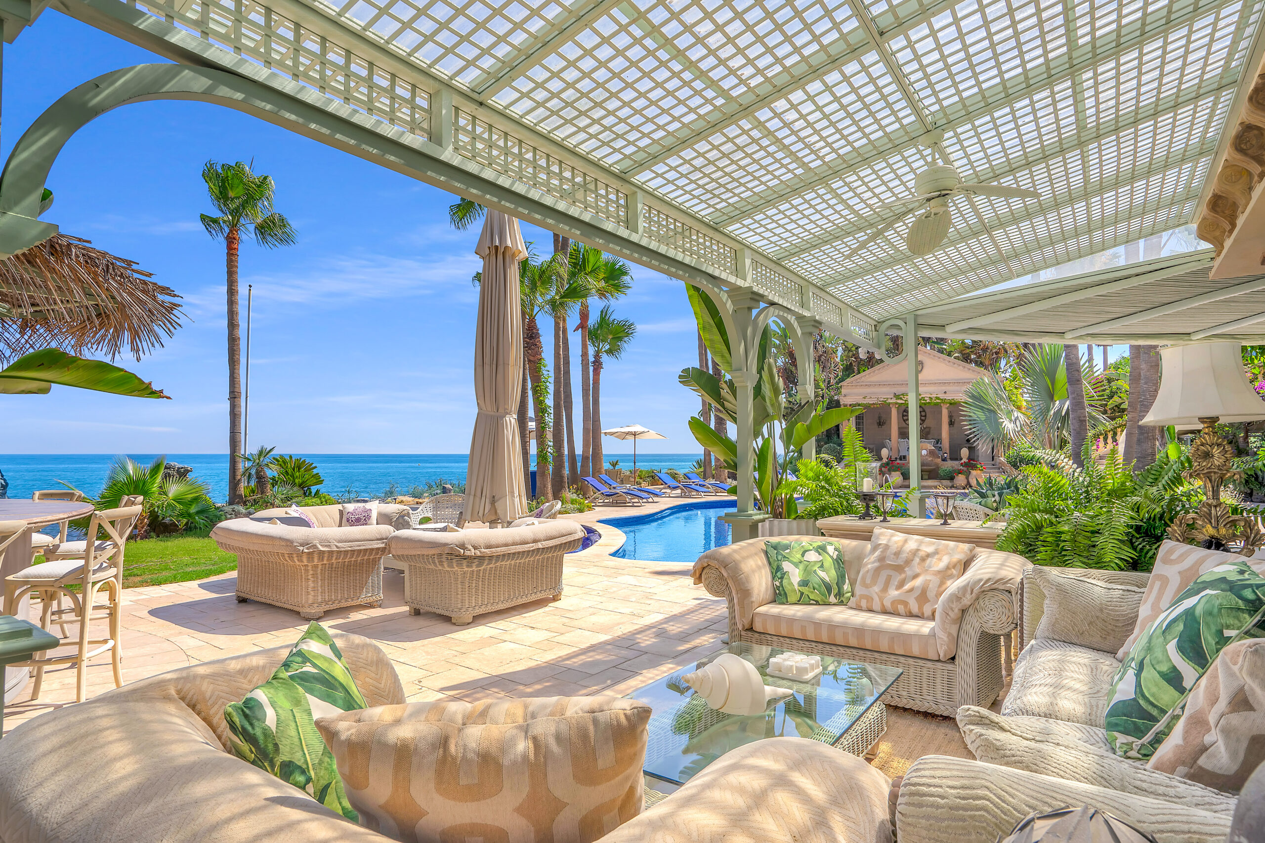 The pool & jacuzzi sit in the heart of the garden, surrounded by palms and beautiful flowers, the sea is so close you can hear it lapping against the shore. The outside bar is adjacent to the pool, where you will find two fridges that will provide you with cool drinks to sip by the pool